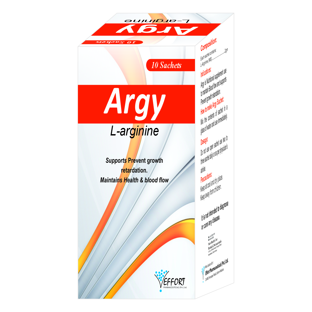 Argy sachet contains L-arginine which is an amino acid that helps the body build protein. Your body usually makes all the L-arginine it needs. L-arginine is also found in most protein-rich foods, including fish, red meat, poultry, soy, whole grains, beans and dairy products.